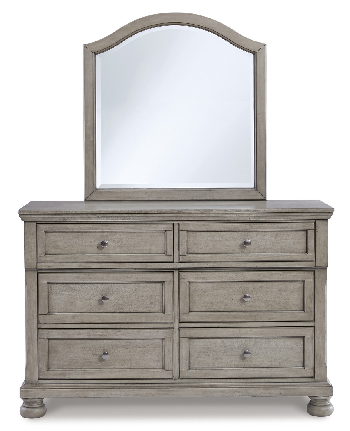 Made with select Birch veneers and hardwood solids. Burnished light gray finish. Drawers feature a silver-tone patina color knob and back plate. Dovetail drawer construction. Drawer interior with color finish. Ball bearing drawer glide. Felt drawer bottoms on select drawers. Beveled mirror.